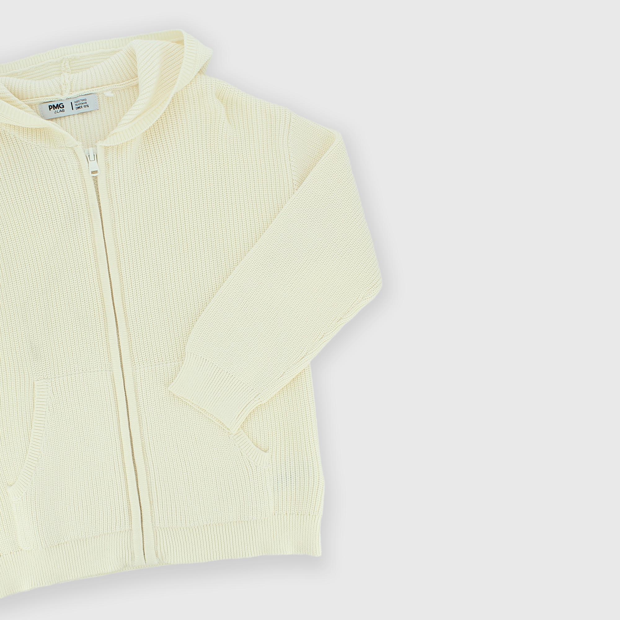 Cardigan tricot in morbido cotone con cappuccio. Chiusura con zip frontale. Tasca a marsupio.