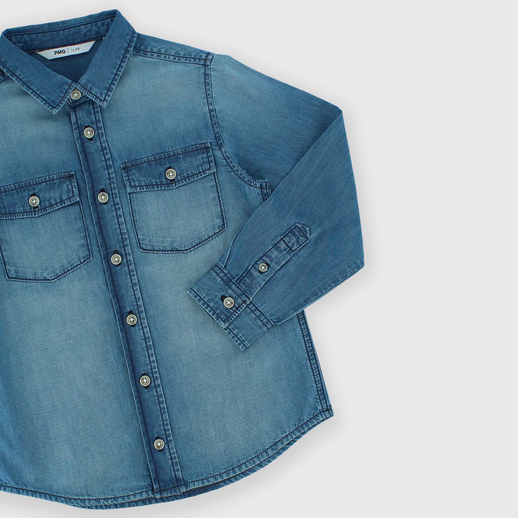 Langärmeliges Jeanshemd. Knopfverschluss auf der Vorderseite. Aufgesetzte Taschen mit Patte auf der Vorderseite.