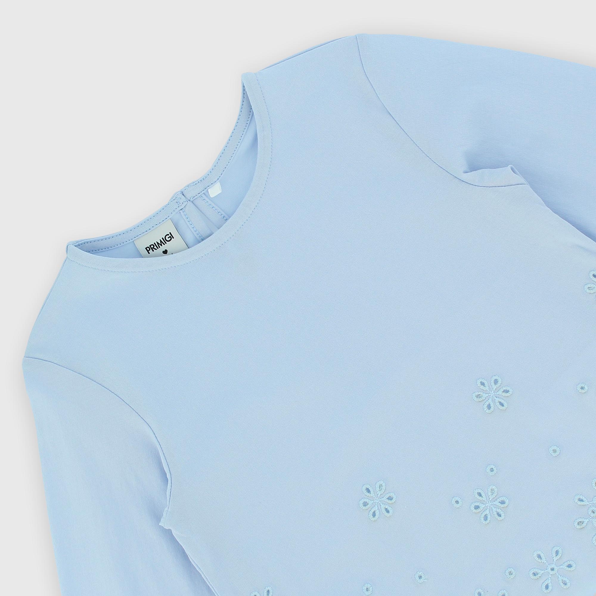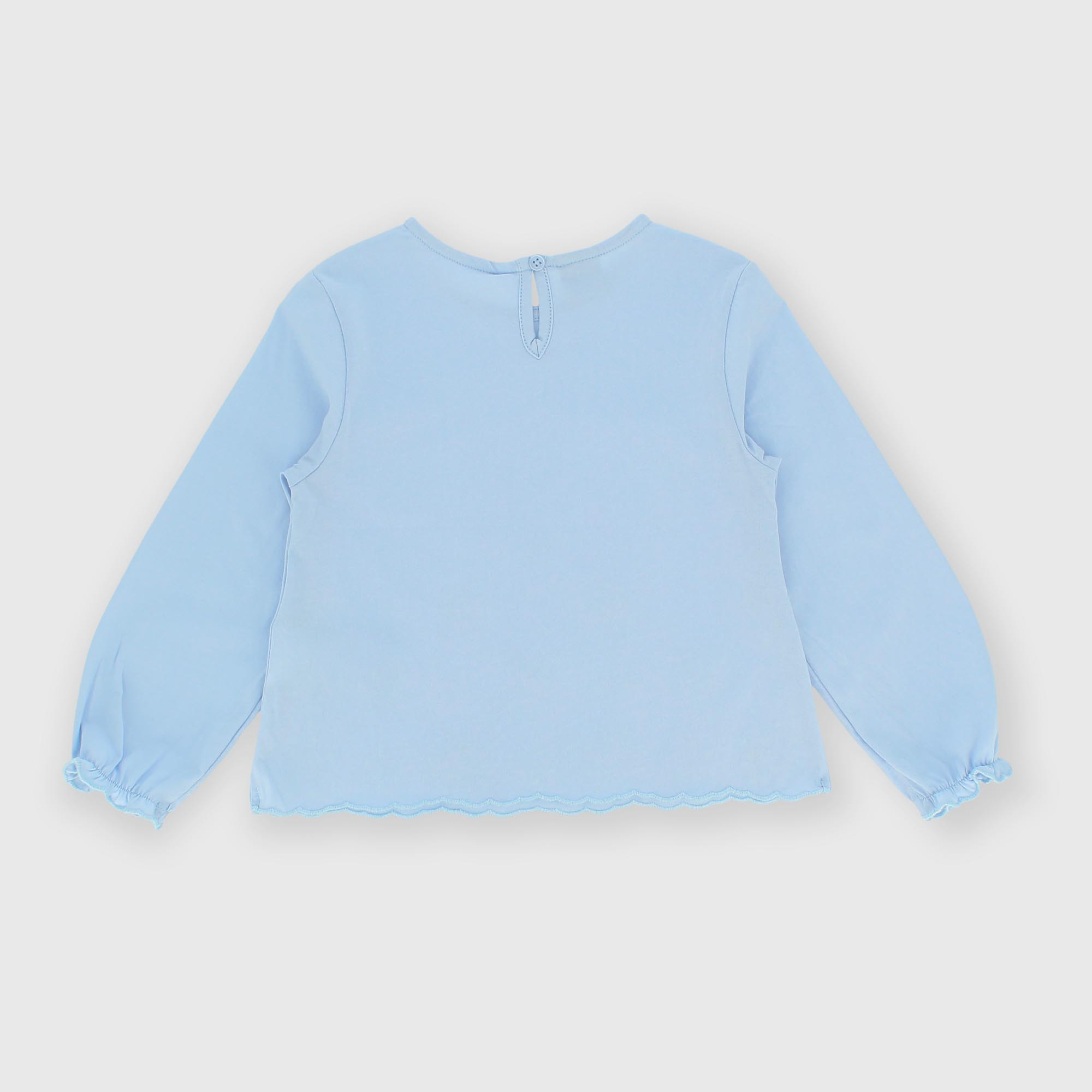 Jersey-T-Shirt, Rundhalsausschnitt, lange Ärmel. Tropfenförmiger Knopfverschluss auf der Rückseite. Perforierte Stickerei auf der Unterseite. Geraffte Bündchen mit Gummizug.