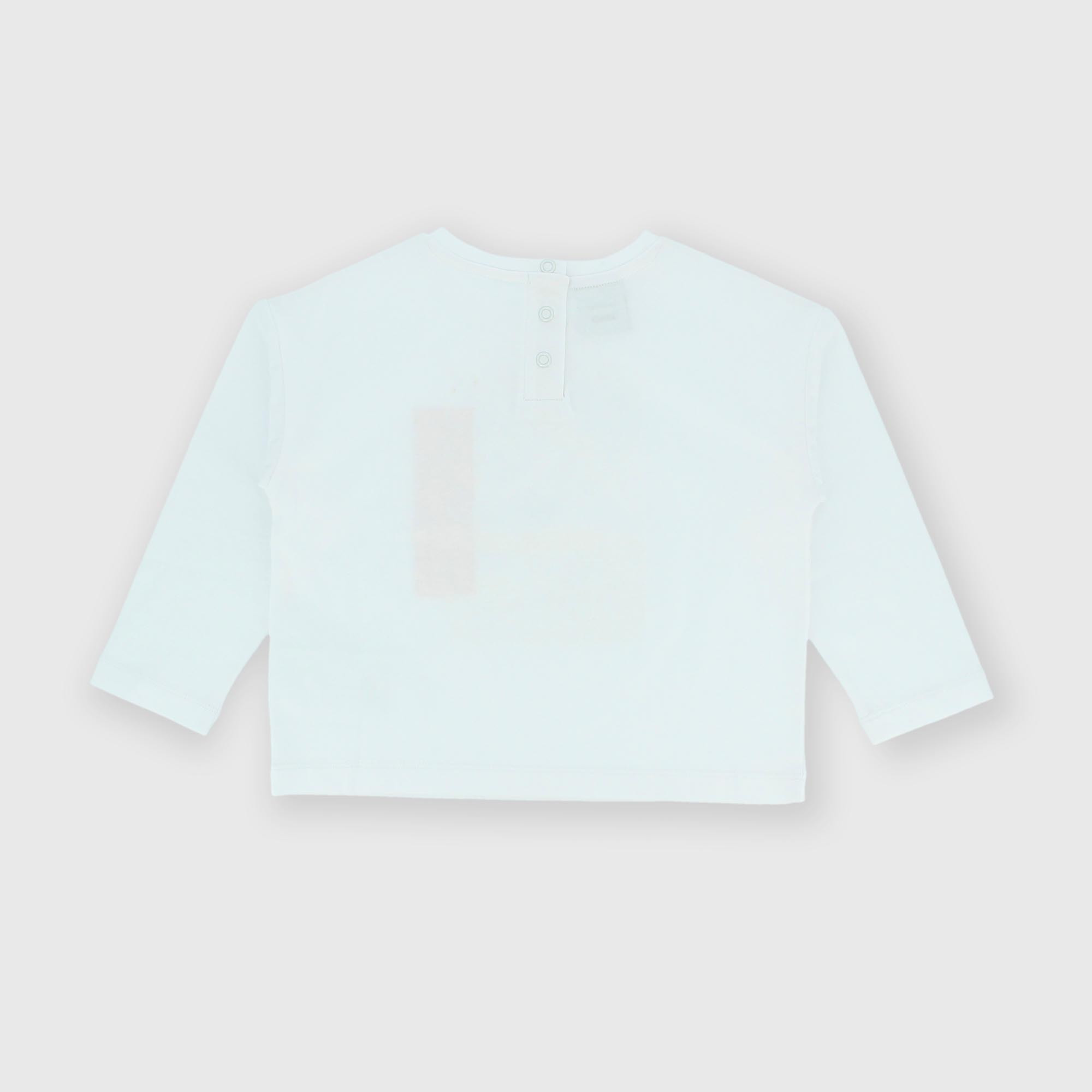 Jersey-T-Shirt, Rundhalsausschnitt, lange Ärmel. Druckknopfverschluss auf der Rückseite. Fotodruck auf der Vorderseite.