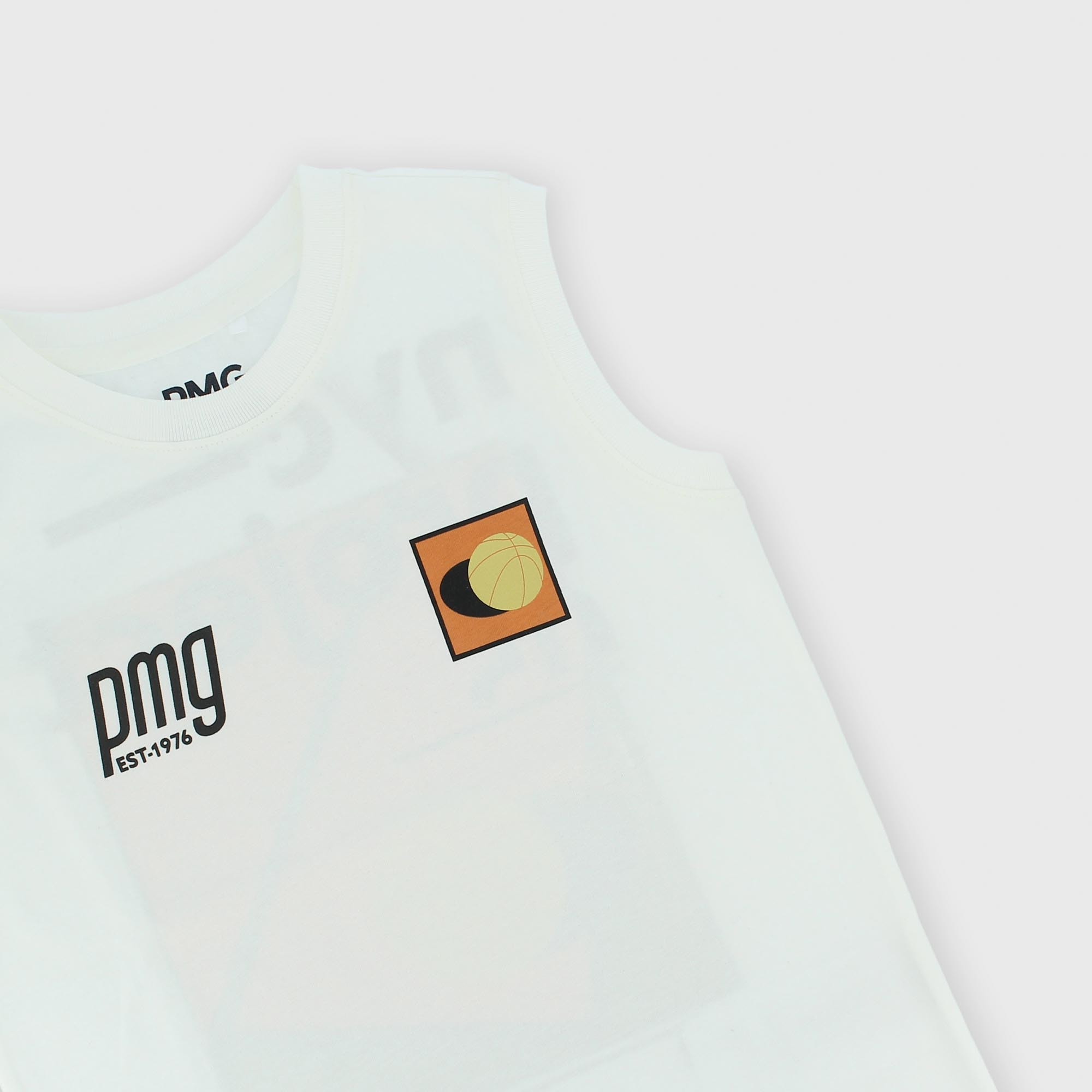 Canotta in Jersey, girocollo. Chiusura con bottoncini automatici sulla spalla. Stampa con dettagli effetto gommato sul davanti e sul retro.