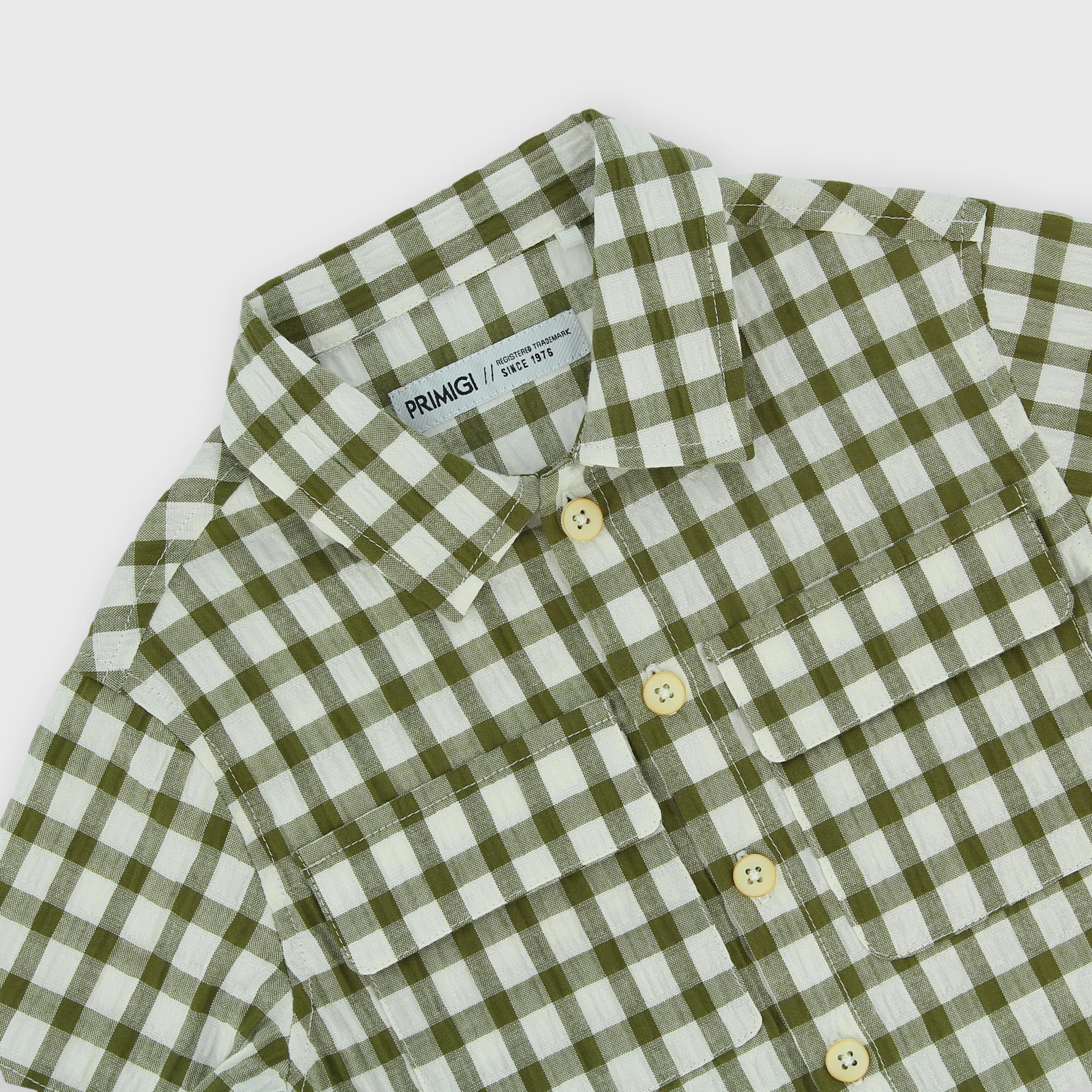 Camicia a quadretti, a maniche corte. Chiusura con abbottonatura frontale. Tasche a toppa con pattina sul davanti.